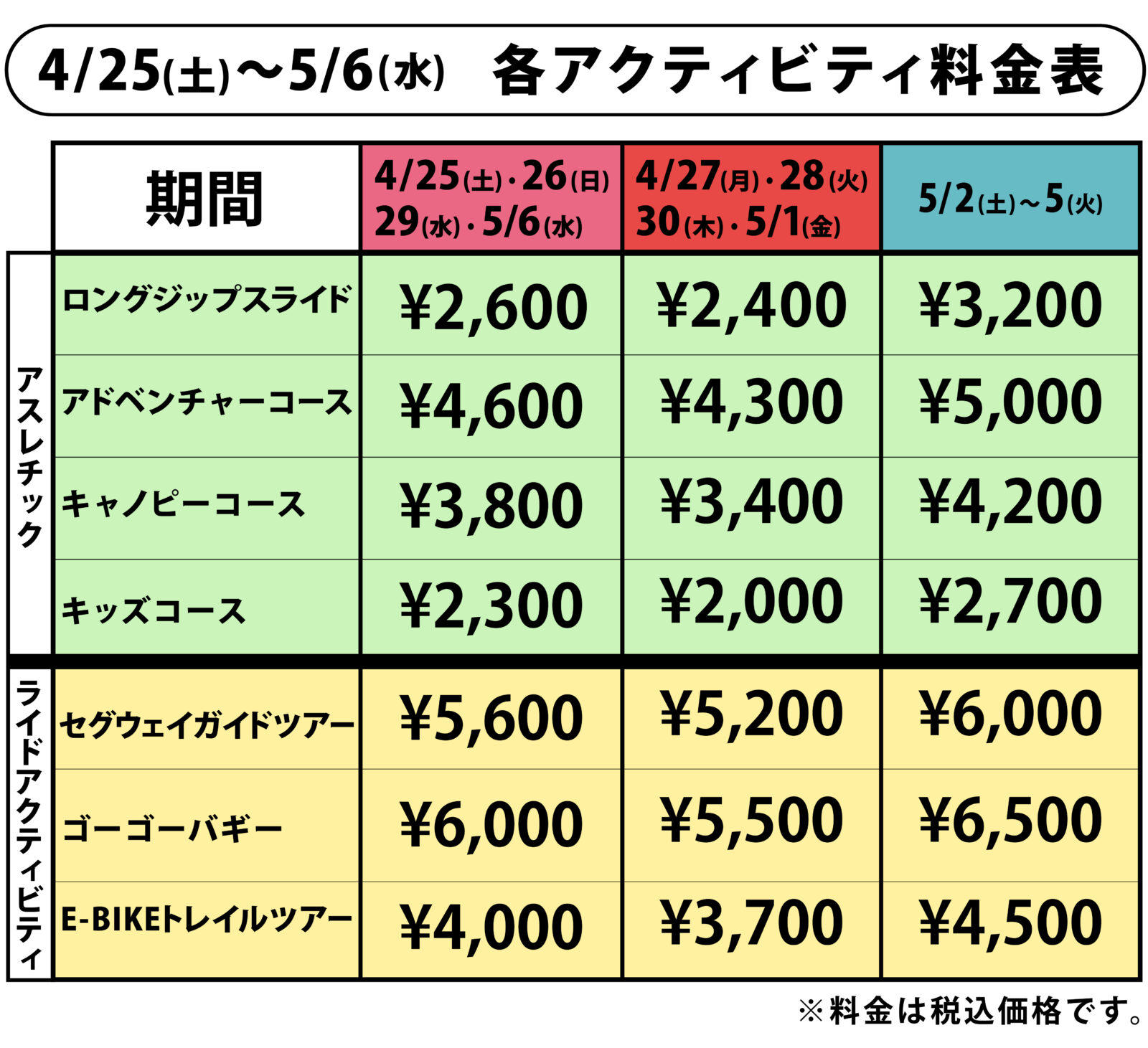 【各アクティビティの料金について】