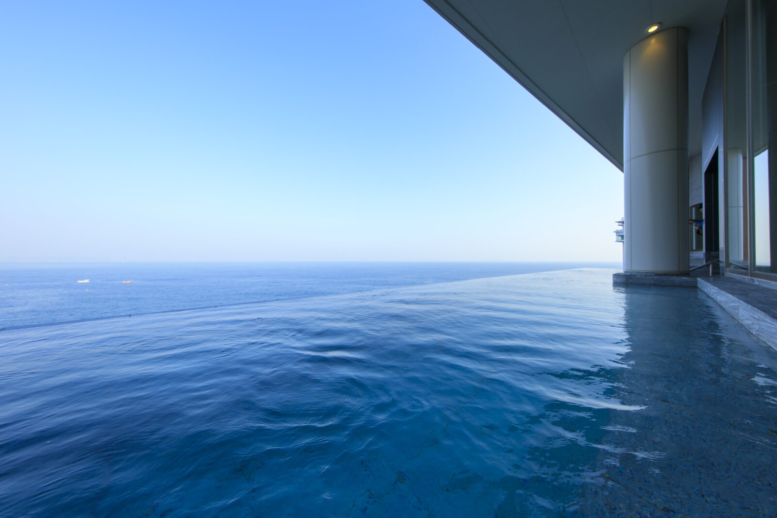 最大の魅力は、まるで海に浮かんでいるような感覚を味わえる、全長約25mの露天立ち湯です。