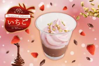 いちごとチョコの二層に分かれた滑らかムース。コクのあるピスタチオと相性抜群なスイーツに仕上げました。